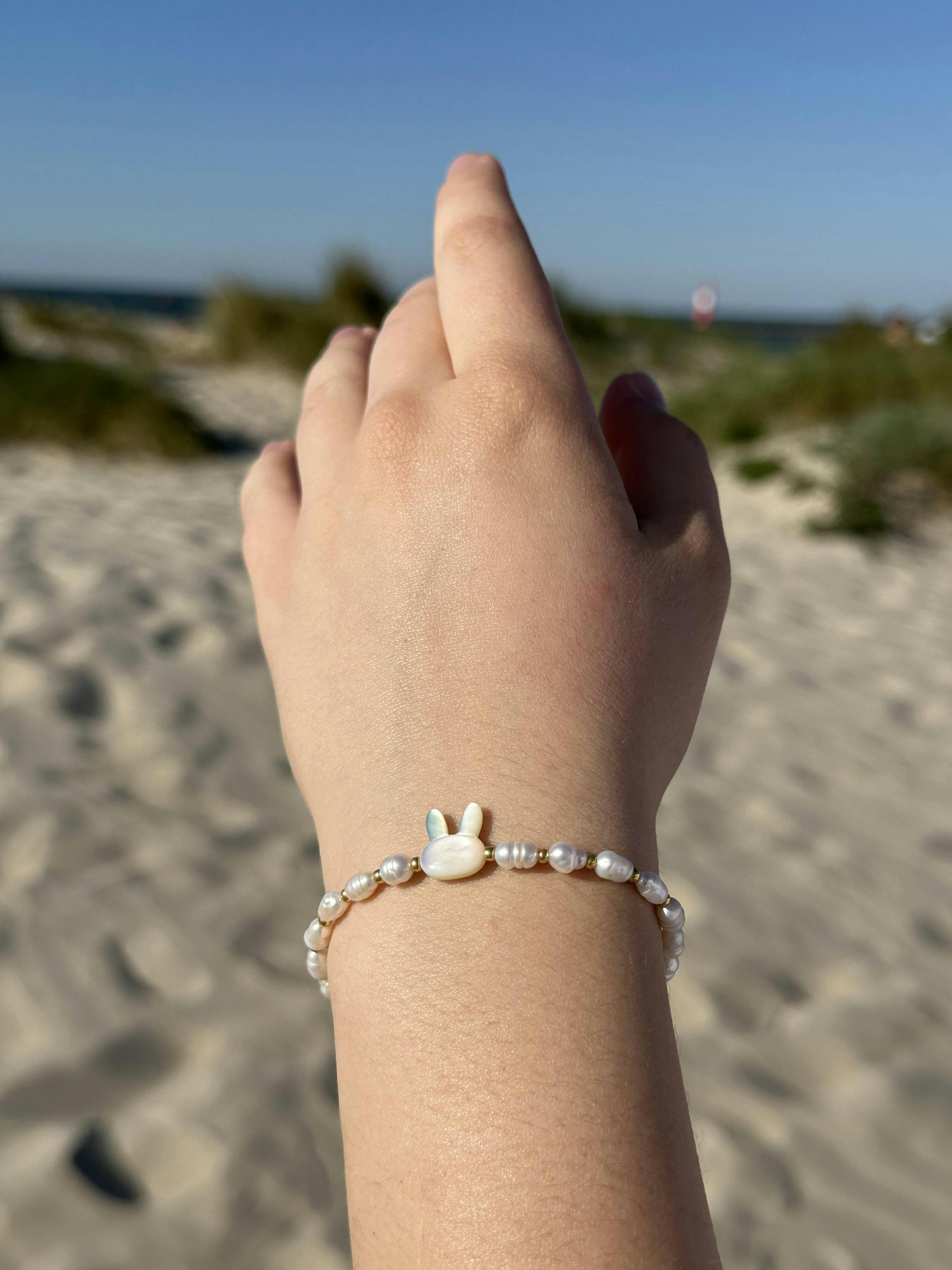 Elevate your style with our elegant Bracelet Pearly Toy. Crafted with a delicate pearl bracelet, this stunning piece is adorned with a charming little bunny made of mother of pearl. Add a touch of sophistication to any outfit with this unique accessory.